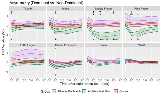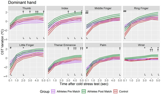 The CST variation of the asymmetry was higher in the fingers than in Thenar, Palm and Wrist regions in all the groups (Figure 5). Negative and lower asymmetry variations (p < 0.05) were obtained when post-match measurements were compared with those of the pre-match group (in Thumb, Index, Middle and Ring fingers) and control group (in Middle and Ring fingers, and Thenar Eminence), especially in the first three minutes of the Tsk restoration. However, no differences were found between the pre-match group and control group (p > 0.05). According to the CST variation of the dominant and non-dominant hand (Figure 6 and Figure 7), it was higher in the post-match than control and pre-match groups in both hands. In addition, in only the dominant hand the CST variation was also higher in the pre-match group compared with the control group in the Middle, Ring and Little fingers and the Palm (p < 0.05) at the moment immediately after the CST.
