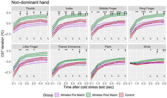 Mean and standard deviation of the CST variation in non-dominant hand for each minute after CST in all the groups. L = Large Effect Size. Difference between Athletes Group—Post Match and Athletes Group—Pre Match († p < 0.05; †† p < 0.01); Difference between Control Group and Athletes Group—Post Match (* p < 0.05; ** p < 0.01; *** p < 0.001).