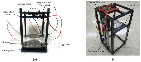 Figure 2a shows the system used in the actual experiment, except for the thermocycler. Figure 2b shows a system with a linear actuator in the initial setup. In order to prevent light reflection and light penetrating from outside, a dark room was created by assembling a matte black acrylic wall. The system was also secured using matte black aluminum supports. At the bottom of the system, there was a heating block with 25 wells into which 25 tubes could be inserted. For the lid heater, 1 mm of black aluminum, which was as thin as possible, was used, and 25 holes were drilled to capture the fluorescence of the tube. The Fresnel lens was effective when its diameter was larger than the diameter of the heating block, and a lens similar to the focal length of the camera was selected. The lid heater and Fresnel lens had to be mounted at a minimum distance. In addition, during the continuous PCR experiments, there was a possibility that deformation would occur due to the heat of the lid heater, so a distance of 5 mm was used.