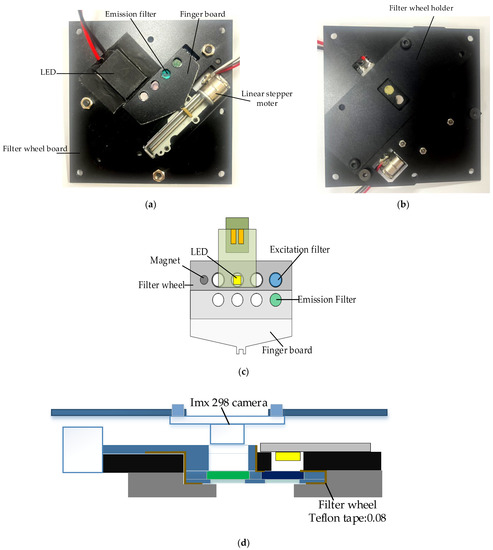 (a) Back of system board with filter wheel module and LEDs attached; (b) front of system board with filter wheel module attached; (c) system structure diagram of filter wheel module; (d) side view of filter wheel module and detector module.