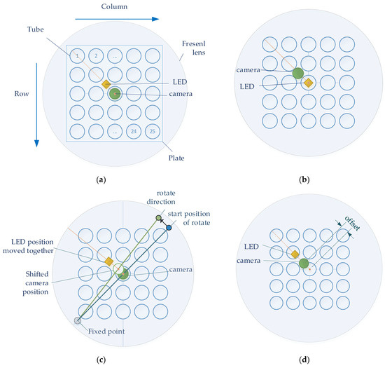 Figure 4 shows four experimental methods for the detection of stable fluorescence. To achieve the effect of a Fresnel lens, the camera and LED were located in the center of the lens at the effective focal length of the lens. In order to obtain the maximum SNR, an experiment was conducted according to the position of the camera and LED. In the four figures in Figure 4, the large circles show the Fresnel lens, and the 5 × 5 blue circles inside the square plate represent the tubes containing the reagents. The orange dot represents the camera and LED corresponding to the center of the tube and lens located at (3.3) on the plate. The orange line shows the orientation of the camera and lens from the center. Figure 4a,b show the experimental methods used to investigate the change in fluorescence brightness according to the arrangement of the camera and LED. Figure 4a shows how the camera was positioned in the center of the Fresnel lens and position the LEDs towards the second quadrant. Figure 4b shows how to position the LED in the center of the Fresnel lens and position the camera towards the second quadrant. Figure 4c,d show the experimental method used to obtain the change in brightness according to the position movement after positioning the camera and LED. In both experiments, the camera board and the filter wheel board were fixed. Figure 4c shows the method of arbitrary rotation from 1 mm to 6 mm in 1 mm increments to detect the change in fluorescence. The support located in the third quadrant (gray dot) was fixed, and the support in the first quadrant (blue dot) was rotated in the direction of the second quadrant. The supports were spaced and collinear with the center of the tube at each corner. After using the method in Figure 4c, the camera and LED were positioned in the same radial direction from the center of the Fresnel lens to reduce light reflection. Figure 4d shows how an ideal fluorescence value can be obtained depending on how far away it is in the 45-degree direction from the center of the Fresnel lens.