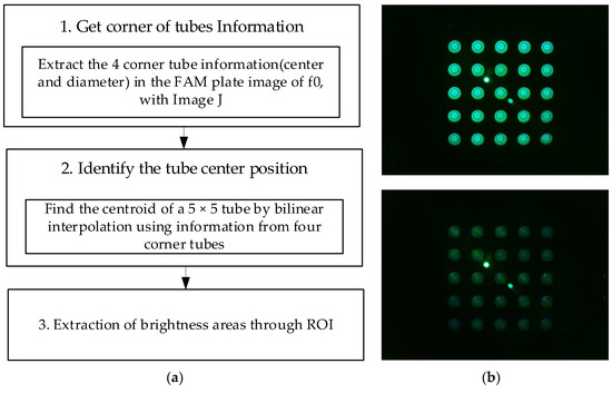 (a) Image processing for 25 tubes; (b) FAM plate (f0) and DDW plate (d0) images.