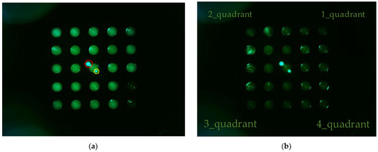 Figure 6 shows (a) the FAM plate f0 image and (b) DDW plate d0 image from an experiment that investigated the fluorescence brightness when the camera was placed in the center of the Fresnel lens and the LED was placed on the outside. The camera was set to gain 0, PWM 200. In the FAM plate in Figure 6a, the (4.5) and (5.5) position tubes were injected with DDW to determine the presence or absence of FAM reagent. In Figure 6a, the dots surrounded by the red circles around (3.3) are the light reflected by the Fresnel lens, and the small dots surrounded by the yellow circles are the light reflected back through the Fresnel lens. Therefore, the DDW plate image d0 in Figure 6b also displays reflections. In addition, the d0 plate image shows intermittent fluorescence reflection in the second and fourth quadrants.