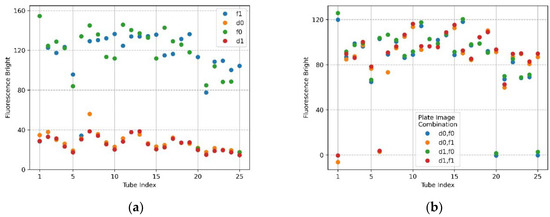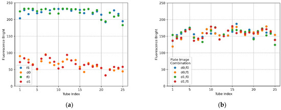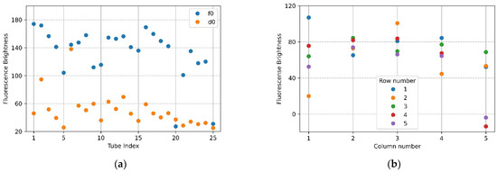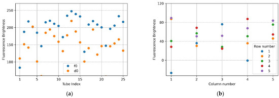 Figure 7a,b show the mean brightness of each of the 25 tubes and the difference between the mean brightness of the tubes in the same position. The blue scatter in Figure 7a indicates f0, and the yellow scatter indicates d0. The x-axis in Figure 7b represents a column number of tubes, and each scatter shows a row of tubes for each column. Referring to Figure 7a (f0), the brightness of the upper and lower tubes at both ends appeared to drop, and in the scatter in Figure 7a (d0), it can be seen that abnormally high fluorescence brightness appeared due to reflection. Therefore, in the f0 image in Figure 7a, the fluorescence brightness of the tube (20.25) injected with DDW reagent was scatter 4 and 5 on the x-axis 5 of Figure 7b. In the d0 plate image in Figure 6b, the tubes (tube index 6 in Figure 7a) with high brightness due to reflection were the second scatter of x-axis 1 (column number) with a small difference in brightness in Figure 7b. For 22 tubes, the mean brightness of f0 was over 140, and the mean brightness of d0 was about 33—this excluded the tubes with the three prominent fluorescence values mentioned above. The mean of the relative brightness gain of the 22 tubes at the same position on the f0 plate and the d0 plate was 3.5, and the relative standard deviation of the mean brightness difference was 13.9.