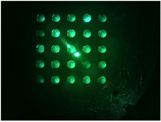 Figure 8 shows a d0 image when the LED was placed in the middle of the Fresnel lens and the camera was placed on the outside. The camera was set to gain 0, PWM 200. The distance between the camera and the LED was set to be the same. The d0 image shows that the fluorescence brightness of the tubes was not constant, and the light reflection was severe.