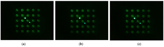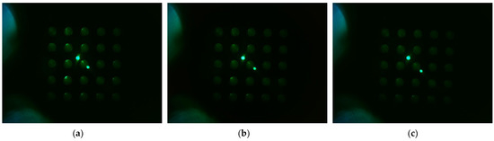 Figure 10 shows the d0 image when the filter wheel board and camera board rotated together toward the second quadrant after the camera was placed in the center of the Fresnel lens. The camera was set to gain 0, PWM 200. Figure 10a shows the fluorescence brightness image of the DDW-filled tubes, which were rotated by 4 mm; Figure 10b, 5 mm; and Figure 10c, 6 mm. As the rotation distances increased, almost no reflection was seen in the second and third quadrants.