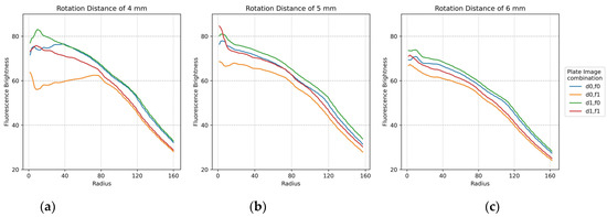 Change in brightness of plate d0 image when rotating in the direction of quadrant 2 with camera placed in the center of lens, LED placed outside, and camera board and filter wheel board fixed to each other: (a) brightness when rotated by 4 mm; (b) brightness when rotated by 5 mm; (c) brightness when rotated by 6 mm.