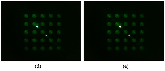 Figure 5a shows the image-processing process for the area of the tube where fluorescence is visible after obtaining the entire image of 25 tubes. In the DDW plate image (d0,d1), there are cases where fluorescence cannot be seen even if the brightness is increased to increase visibility. Therefore, images from the FAM plate were used to determine the properties of the tube. The FAM plate images (f0) taken in all four of the experiments were obtained using an image-processing program (ImageJ). Information regarding the center and diameter of the tubes located at (1.1), (1.5), (5.1), and (5.5) of the plate was directly marked and obtained. As the distance between the wells was constant, the spacing of the tubes in the plate was the same. Therefore, information regarding the tube at each corner and the bilinear interpolation method could be used to obtain information regarding the centroids of 25 tubes in plate f0. The centroids of the 25 tubes obtained through plate f0 were substituted for plate images f1, d0, and d1. The brightness of the fluorescence was detected by designating a region of interest equal to the size of the radius from the center of each tube. After determining the radius at which the most stable brightness was obtained during fluorescence detection according to the radius, the brightness within the corresponding range was compared. Figure 5b shows an image of the plate taken after being pushed 4.5 mm in a 45-degree radial direction from the center during the experiment shown in Figure 4c. In Figure 5b, the upper right image is an ROI image of the unrotated plate image f0. In Figure 5b, the lower right image is a d0 image obtained by ROI by substituting the information regarding the center of the tube obtained through f0. The two instances of fluorescence in the center of f0 and d0 were not relevant as they were light reflected by the LED. The red dot represents the center of each tube, and the blue circle represents the actual size when set to a radius of 50 pixels.
