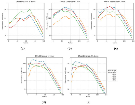 Minimum difference in mean fluorescence brightness according to the radius for FAM and DDW plate image combinations regarding offset distance: (a) 3 mm; (b) 4 mm; (c) 4.5 mm; (d) 5 mm; (e) 5.5 mm.