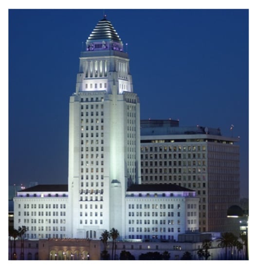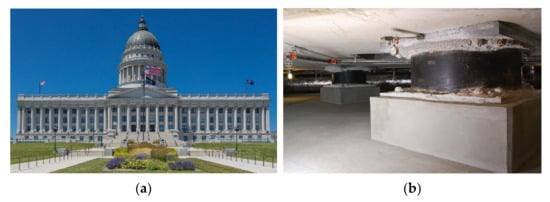 The installation of devices that decouple the structure or its main elements from potential hazardous earthquake-induced ground vibrations or support motions is the basic concept behind base isolation, also known as seismic isolation. This uncoupling is achieved by increasing the system’s flexibility and providing appropriate damping. This may be done using a laminated rubber (elastomeric) bearing base isolator with or without lead [11]. Base isolation can also be achieved using friction pendulum seismic isolation bearings [11,12,13,14,15,16,17,18] at each support point; this makes the structure sway with a gentle pendulum motion during earthquake ground shaking. This allows the ground to shake without damaging the structure. Friction isolation devices, yielding steel energy-absorbing devices [19,20,21] and visco-elastic [22,23] and fluid-viscous damping devices [24], are also used for base isolation. Mostly, the base isolation technique is used for low- to medium-rise buildings for seismic response mitigation [25,26,27,28,29,30,31,32,33,34]. However, recently, the application of isolation is proposed for high-rise buildings [35,36,37,38,39,40,41]. A detailed review of the base isolation system was recently provided by Beirami Shahabi et al. [42]. In addition, the base isolation techniques are practically used in real-life structures worldwide. Several buildings are already isolated around the world, and the greatest examples are the Utah State Capitol building and Los Angeles City Hall (see Figure 3 and Figure 4).