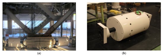 Despite the growing interest for the inerter applications in civil engineering, the majority of the research remains in the numerical simulation stage. However, a few real application to tall buildings can be found. Hence, a building in Sendai, Japan was equipped with a tuned viscous mass damper (TVMD) consisting of a viscous damper and a ball screw inerter in parallel connected to a spring in series [71]. The TVMD system is located in the upper floors of the building and aims to enhance the seismic safety of the structure. Both the TVMD and its location within the structure frame can be seen in Figure 6a,b.