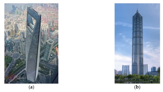 (a) Shanghai World Financial Center https://en.wikipedia.org/wiki/File:%E4%B8%8A%E6%B5%B7%E5%9B%BD%E9%99%85%E9%87%91%E8%9E%8D%E4%B8%AD%E5%BF%83.jpg (accessed on 15 October 2022). (b) Jin Mao towers https://en.wikipedia.org/wiki/File:Jin_Mao_Tower_2007.jpg (accessed on 15 October 2022).