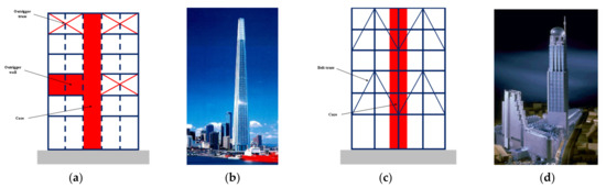 (a) Illustration of outrigger system; (b) Melbourne Tower; (c) illustration of “virtual outrigger” system using belt trusses; (d) Plaza Rakyat tower (Malaysia).