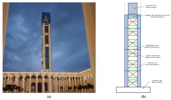 Another example of structural control can be observed in the structural disposition of the minaret of the Great Mosque of Algeria, as can be seen in Figure 13a. The minaret is a slender structure with a height of 265 m above the ground and a square plan having a 26.8 m length on each side. The composite structure comprising four RC cores at the corners, slabs with an RC beam girder, and a stiffening system of steel profiles integrated in the RC cores provide the rising structure’s stiffening system. Due to the height seismicity of Algiers, the steel bracings were made as energy-dissipating components that yield before the foundation fails, in accordance with the aseismic strategy of capacity design. Three different types of earthquake-resisting systems can be differentiated in the load-bearing structure, namely, highly dissipative members, less dissipative members, and elastic members, as can be seen in Figure 13b [100,101,102].