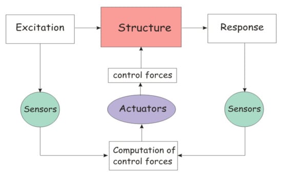 It has the basic configuration shown in Figure 14. In fact, civil structures’ vibrations can be controlled utilizing hydraulic or electromechanical actuator systems powered by a suitable control algorithm, such as closed-loop or feedback, where the control forces are determined by the structure’s feedback response, open-loop or feedforward, where the control forces are determined by measured external excitations, or closed-open loop or feedforward-feedback, where the control forces are determined by both the structure’s measured response and measured. When structure parameters are unknown and are based on tracking error between the measured response and the observed response, a system based on the variation of closed-open loop control with a controller that can adjust the parameters of the system, called adaptive control, can be used [103].