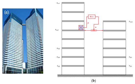 (a) Active CBC of Harumi Triton Square in Tokyo, Japan; (b) model of two adjacent buildings connected with an active strut.