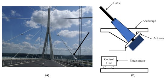 (a) Normandy Bridge equipped with active tendon cable https://upload.wikimedia.org/wikipedia/commons/c/cc/Pontdenormandie.JPG (access on 15 October 2022); (b) active tendon mechanism.