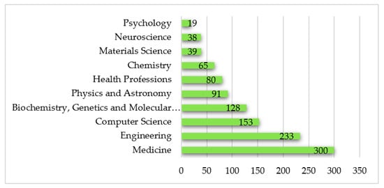 To address SQR 3, a journal analysis was conducted. Studies on WTH were published in a total of 344 academic journals. Table 4 shows the top 10 journals indexed in Scopus with the highest number of publications in this field of study. Sensors (Switzerland) leads this ranking with the highest number of published articles (n = 51; 8.5%), followed by JMIR mHealth and uHealth (n = 31; 5.2%) and by Telemedicine and E Health (n = 26; 4.3%). The subject areas with the highest production in relation to WTH are: (1) Medicine, which leads the ranking with 300 articles in this area; (2) Engineering with 233 studies; and (3) Computer science with 153 indexed articles. The top 10 subject areas related to research on WTH are presented in Figure 5.