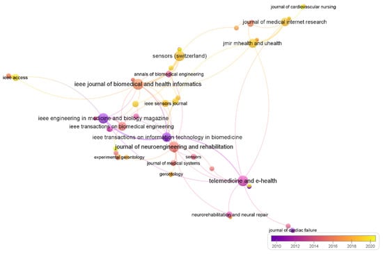 Moreover, of the 344 original sources after screening and imposing a limit of one document per source and a minimum of one citation per source, 260 journals met these thresholds. This procedure was performed to calculate the total strength of the citation links between sources. In this sense, the journals with the strongest citation connections were IEE Journal of Biomedical and Health Informatics (16); Telemedicine and E Health (15); and Sensors (Switzerland) (14). At the same time, the graph represents how journals such as JMIR mHealth and uHealth, IEE Sensors Journal or Sensors (Switzerland) have recently been publishing more on WTH than other journals (see Figure 6).