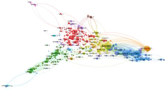 The co-citation analysis was also a key criterion in evaluating the degree of contribution to the area. Co-citation makes use of direct citation relationships and is understood as the frequency with which two documents are co-cited by another document, giving them a possible thematic similarity from the citer’s perspective. Figure 7 shows the visualization of the author cocitation network where each node represents a referenced author (unit of analysis) in the scientific production. The size of a node reflects the number of citations an author has received from the analyzed documents. A total of 35,827 authors were co-cited. To improve the visibility of the figure, the minimum number of citations per author had to be set to 10. In this way, 421 authors met the threshold. The top three most co-cited authors according to total link strength were: Bonato, P. (4942); Hausdorff, J.M. (3524); and Patel, S. (3514). (see Figure 7). Referenced authors who are in the visualization close to each other tend to be more strongly related, based on co-citations, than researchers located very far from each other. Therefore, and by way of synthesis, it can be said that at first information is obtained on the most relevant authors in the field based on the number of citations received and subsequently the co-citation links between the most referenced authors in the production are analyzed. scientific.