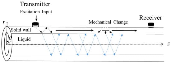 Figure 1 shows a schematic illustration of the propagation of ultrasonic signals in a pipe filled with liquid. The propagating ultrasonic signals are comprised of guided waves in the solid wall as well as liquid-mediated modes in the liquid. The guided ultrasonic signals are then scattered, mode converted, or trapped by mechanical defects, such as geometrical discontinuities, cracks, wall losses, material deposits, etc.