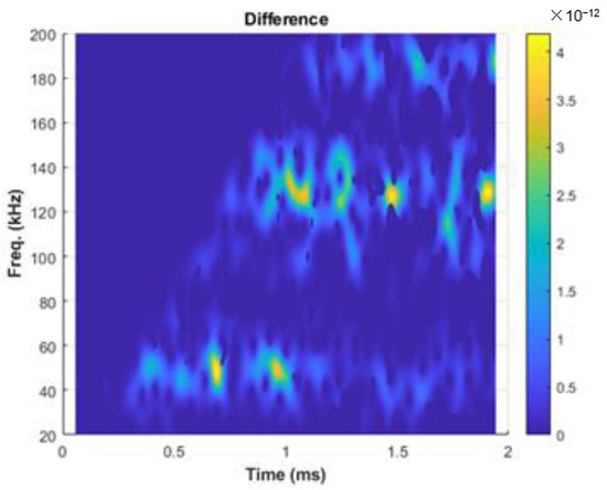 For the 2nd EOC compensation method, a difference transmission signal is defined as a difference between the normalized monitoring transmission signal, , and the normalized baseline transmission signal, . Next, Short-Time Fourier Transforms (STFT) [22] of the difference signals is performed to reveal mixed time-frequency characteristics of the difference signal, as shown in Figure 2.