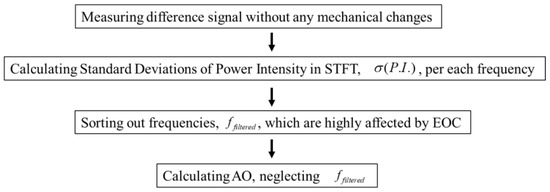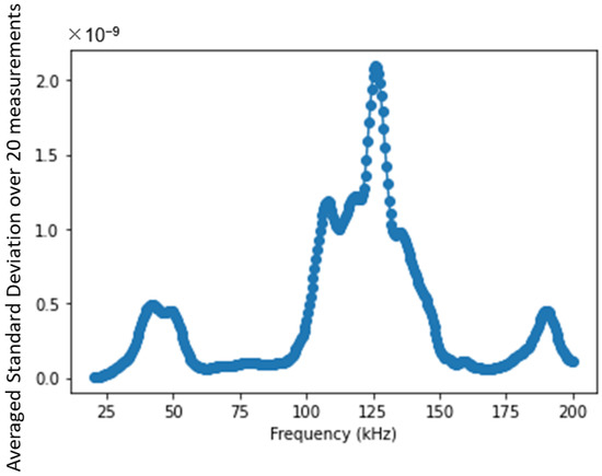 Based on this observation and assumption, the 2nd EOC compensation method is implemented as shown diagrammatically in Figure 3. First, a baseline and a monitoring signal are acquired within the shortest time interval possible (in practice, <1 min is easily achievable), from which a difference signal is calculated. The difference signal thus obtained will be assumed to be predominantly due to liquid-boundary effects with no significant contribution from temperature variation or mechanical changes in the interrogated structure. Then, the difference signal is mapped in the frequency–time domain, using STFT, and the standard deviations of power intensity in the frequency–time domain are calculated per each frequency. This procedure is repeated multiple times till convergence is achieved with a good signal-to-noise ratio in the spectral content. Figure 4 shows an example of the averaged standard deviations of power intensity in STFT for frequencies from 20 to 200 kHz. This profile provides critical information as to which frequencies are most sensitive to the presence of liquid than others. The data corresponding to the most sensitive frequencies are excluded from the estimation of mechanical changes so that the remaining frequency bands will be less dominated by liquid-boundary effects. The degree of exclusion will depend on the specifics of the interrogated zone. This paper shows that even in the case of exclusion of data corresponding to up to 95% of the frequencies, the least sensitive data, related to the remaining 5% of the frequencies, still provides a sufficient signal-to-noise ratio for monitoring of small (<1% localized volume change) mechanical change in the interrogated zone of pipes with fast-flowing water inside.