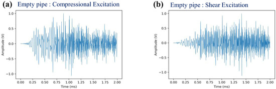 Time domain signals for the empty pipe with compressional (a) and shear (b) excitations.