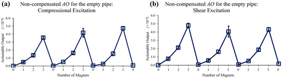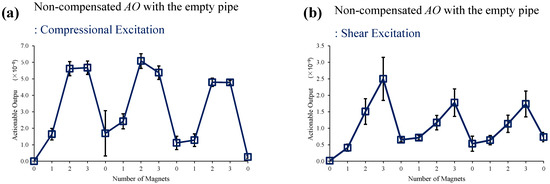 Changes in AO with the different numbers of magnet perturbations for the empty pipe with (a) compressional and (b) shear excitations. No EOC compensation is applied.