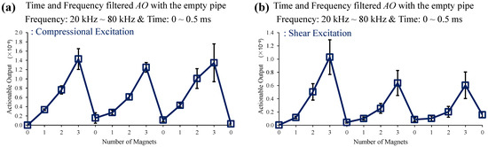 Changes in AO with the different number of magnet perturbations: the empty pipe with (a) compressional and (b) shear excitations. Simple time and frequency filtering lead to improved detection.