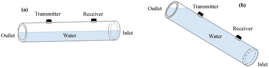 As the first measurement with liquid-boundary conditions, the pipe is filled with stagnant water. Either a pair of compressive or shear transducers are used for compressional or shear excitation and detection, respectively. In addition, two different tilt angles are used to achieve half-filled and fully filled pipe conditions, as shown in Figure 10.