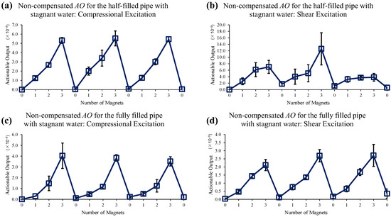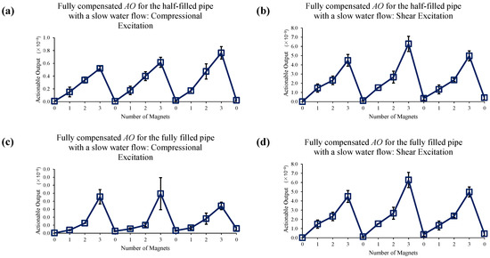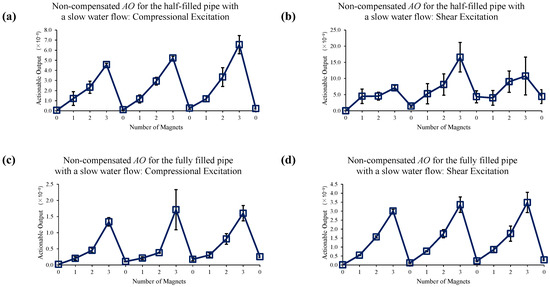 Changes in AO under slow water-flow conditions with the different number of magnet perturbations for the half-filled pipe with (a) compressional and (b) shear excitations; and the fully filled pipe with (c) compressional and (d) shear excitations. No EOC compensation method is applied.