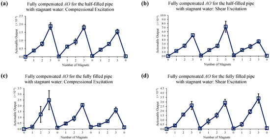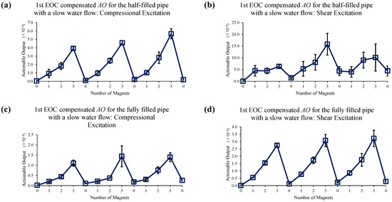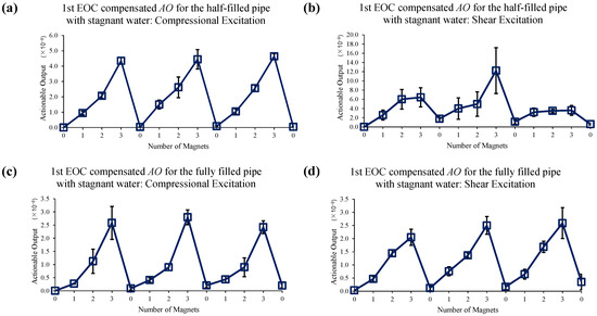 Changes in AO under slow water-flow conditions with the different number of magnet perturbations for the half-filled pipe with (a) compressional and (b) shear excitations; and the fully filled pipe with (c) compressional and (d) shear excitations. The full, two-level EOC compensation method is applied.