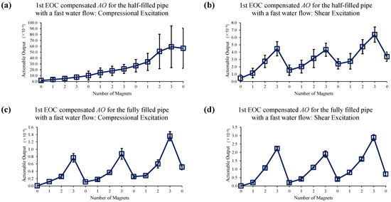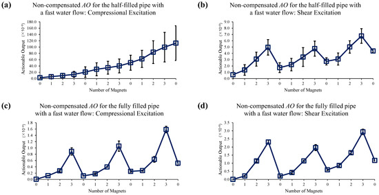 Changes in AO under fast water-flow conditions with the different number of magnet perturbations for the half-filled pipe with (a) compressional and (b) shear excitations; and the fully filled pipe with (c) compressional and (d) shear excitations. No EOC compensation method is applied.