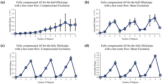 Changes in AO under fast water-flow conditions with the different number of magnet perturbations for the half-filled pipe with (a) compressional and (b) shear excitations; and the fully filled pipe with (c) compressional and (d) shear excitations. The full, two-level EOC compensation method is applied.
