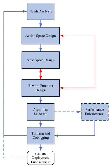 As shown in Figure 1, a DRL algorithm that wants to solve a practical task must go through the following steps: The first step is to conduct a requirements analysis to objectively assess the adaptability and performance improvement of the DRL for the task at hand and to identify the agent and environment in the task. Next, the core elements of the state space, action space and reward function are designed separately to complete the complete definition of the reinforcement learning problem. Then, a suitable DRL algorithm is selected with the task characteristics, and the policy model is obtained after training and debugging. If the performance of the policy is not satisfactory, the above process and algorithm details need to be continuously improved based on the results of the experiments and additional performance enhancement measures taken if necessary until a satisfactory policy is achieved. Ultimately, the trained policies are deployed in real application environments.