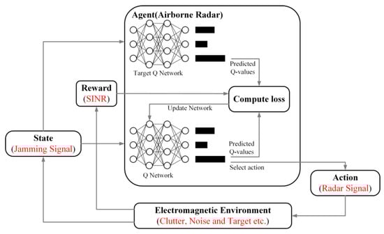 Deep Q network (DQN), one of the classical algorithms for deep reinforcement learning, is highly regarded by the academic community. To address the situation in which cognitive radars do not know the exact jamming model, Li K. et al. [28] used reinforcement learning algorithms to design a frequency hopping strategy based on frequency agile radar. Based on this, Li K. et al. [29] also proposed a DQN-based frequency agile (FA) radar strategy design method, which achieves radar anti-jamming with a high target detection probability. Then, they [30] applied deep reinforcement learning to the design of an anti-main-lobe jamming strategy for frequency shortcut radar and achieved intelligent selection of pulse carrier frequency. The literature [31] used deep Q networks and long- and short-term memory networks to generate frequency hopping strategies under a partially observable Markov decision process model to improve cognitive radar anti-jamming performance. To address the problem of coexistence between radar and communication systems, the literature [32,33] modelled the radar environment as a Markov decision process to predict the frequency band with the lowest jamming energy and successfully avoided jamming from communication systems. In the literature [34], a deep deterministic policy gradient cognitive design based on a control framework was proposed for the radar power allocation problem in multi-manoeuvre target tracking.