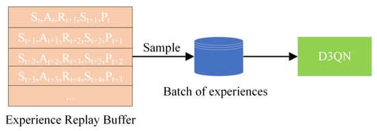 To help the radar fully learn and adapt to the current electromagnetic countermeasure environment and to improve the speed of environmental information acquisition, an empirical replay method is used. First, the data, such as the action, , selected by the radar, the new jamming state received, , the calculated reward value, , and whether the interaction is in the terminated state, , in each jamming state, , during the interaction between the radar and the complex electromagnetic environment, are recorded as , and all are stored in the replay buffer . Second, when the number of data reaches a set batch size, a batch of data is evenly and randomly selected and put into the neural network for training. Then, after training, the radar continues to interact with the electromagnetic environment and repeats the operation. A batch size of data is sampled uniformly and randomly each time to train the neural network, which improves data utilization and reduces the overfitting problem arising from training. The experience replay process is shown in Figure 7.