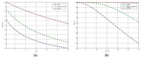 From Figure 12a, it can be seen that the SJNR of all three radar transmit signals decreases continuously as the jamming signal power increases, but the SJNR of the anti-jamming waveform strategy generated by the D3QN algorithm decreases significantly less than the other two strategies, and the anti-jamming strategy based on the strategy iteration algorithm also significantly outperforms the LFM signal. Similarly, as can be seen from Figure 12b, the target detection probability of the three radar signals decreases as the jamming power increases, but the optimal radar strategy obtained in this chapter has a lower target detection probability than the other two strategies, being 2.01 dB and 2.68 dB higher, respectively. Until the jamming power increases to 30 W, the target detection probability of this optimal strategy is still 99.84%, which is 7.57% and 15.89% higher than the signals generated by the iterative strategy method and the LFM signal.