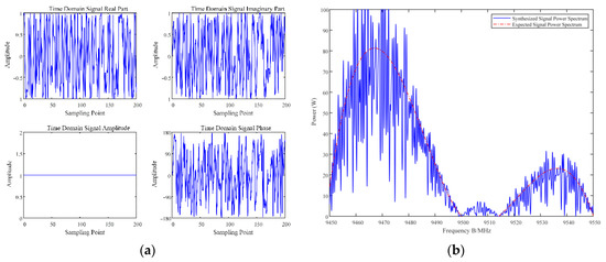 The radar time domain signal is synthesized according to the radar optimal anti-jamming frequency domain strategy in Figure 10c, and its frequency domain characteristics are verified, and the results are shown in Figure 14. Among them, Figure 14a depicts the real part, imaginary part, amplitude spectrum and phase spectrum of the synthesized time domain signal; Figure 14b shows the results of the frequency domain characteristics of the verified time domain waveform; the red dashed line is the optimal frequency domain strategy designed by the method in this paper, and the black solid line indicates the spectrum of the synthesized time domain signal by ITM. It can be seen that the synthesized time domain signal better achieves the frequency domain characteristics of the optimal strategy and has low interception performance, showing behaviours such as constant envelope and anti-jamming.