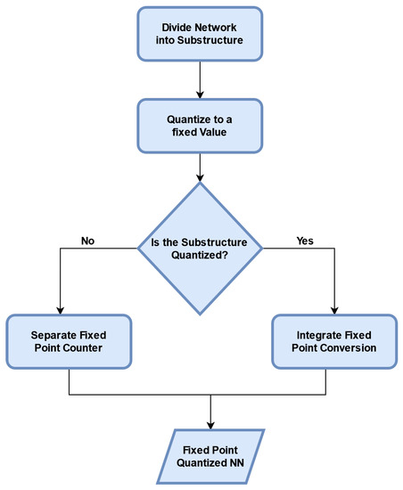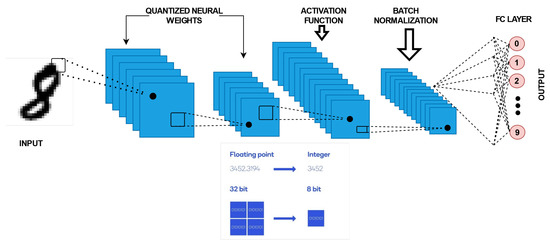 As mentioned, QNNs are low-precision neural networks and can perform similarly to CNN while safeguarding the network structure. A BNN is also a form of a QNN. It defines the model parameters that are conserved by using a smaller bit width; moreover, the model size is reduced several times. QNN consists of a quantization layer, a multiply accumulation (MAC) layer, and a batch normalization layer. Although the storage and computation costs are greatly reduced, data loss due to quantization errors occurs under tradeoff conditions. A suitable quantization architecture should be able to store useful information in continuous variables and is critical to network performances. Figure 7 describes the typical blocks of a QNN flowchart.
