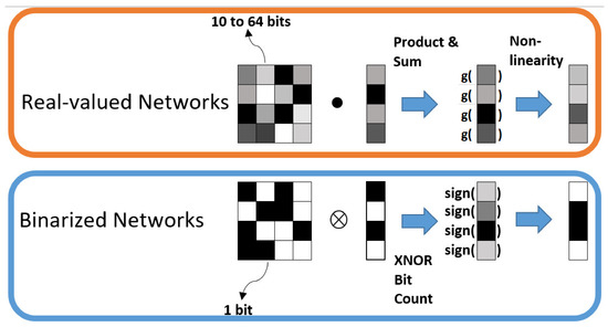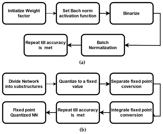 DNNs are computationally expensive and memory intensive for training and storing models. For miniature devices such as IoT devices, this poses a challenge. The binary neural network (BNN) is bounded by the set [+1, −1] [26]. BNNs require much less memory, which is why they are preferred for low-power devices [27]. A single-bit of binary data occupies only 1/32 times of the memory needed for a 32-bit display and has 32 times less memory access. A BNN’s architecture is almost identical to that of a CNN; the only difference is that all of its parameters are binarized to either +1 or −1. The −1 is encoded as 0, and +1 is encoded as 1. While using the CIFAR-10 dataset, the BNNs, constructed in the beginning, lost roughly 3% of their accuracy. Binary convolution is easy, as it is computed as 0, 1, and its hardware execution is as easy since it uses a simple XNOR function with a smaller portion. This leads to a lower hardware cost for binary arithmetic. Figure 6a roughly describes the flowchart block of a BNN.