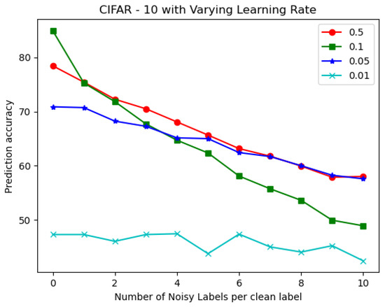 The FPGA-based IoT device is shown in Figure 9a, and the setup is shown in Figure 9b. Figure 10 shows the validation accuracy of the CIFAR-10 with the varying learning rates. The learning rate should be chosen optimally. The learning rate with 0.01 showed a low prediction rate, and 0.5 had a high prediction rate for QNN, but it decreased sharply with noisy labels.