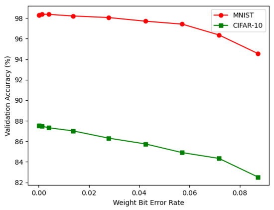 Weight bit error rate for the validation accuracy for the MNIST and CIFAR-10 databases.