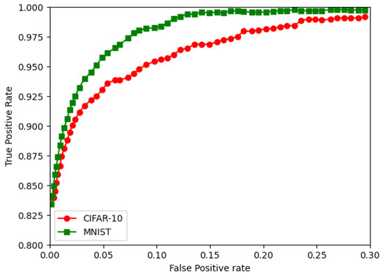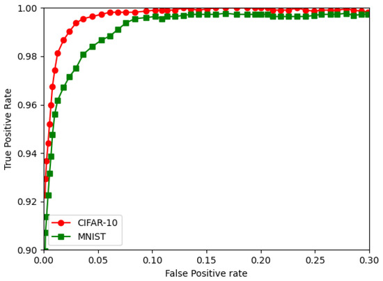 The RoC curves for the CIFAR-10 and MNIST for the CNN.