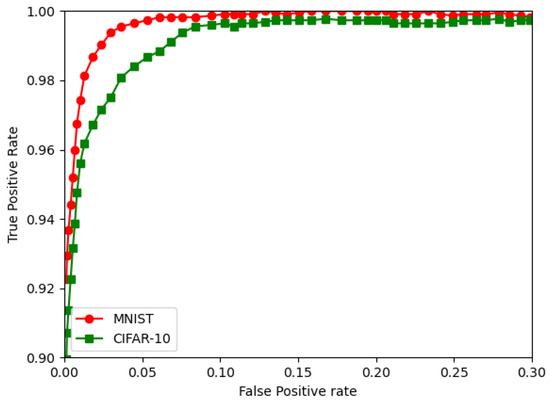 The RoC curves for the MNIST and CIFAR are shown in Figure 12, Figure 13 and Figure 14. They show the FPGA for the CNN, followed by the BNN and QNN, respectively.