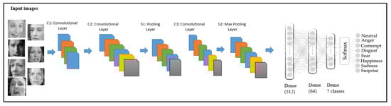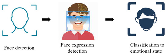 Facial expressions can be easily observed and distinguished as a communication technique in the field of psychology [20]. Facial expressions provide information about a person’s emotions. FER analysis consists of three steps: (a) face detection; (b) facial expression detection; and (c) expression classification into an emotional state as shown in Figure 2.