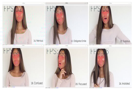 To train the model with only eye- and eyebrow-based landmarks, we first gained weights for the emotion detection model. We trained the Haar–cascade classifier to detect faces and emotions. After detection, we captured coordinates of emotional class landmarks and exported to a comma-separated values (csv) file in seven emotional classes. After the emotion detection model was trained, we applied landmarks of the eyes and eyebrows and specified emotional classes to that model. Landmarks were adjusted to relative emotional classes. In Figure 6 we can see some relevant landmark points for seven emotional classes. The model was trained on a multi-class classification model in order to understand the relationship between emotional classes and representative coordinates.