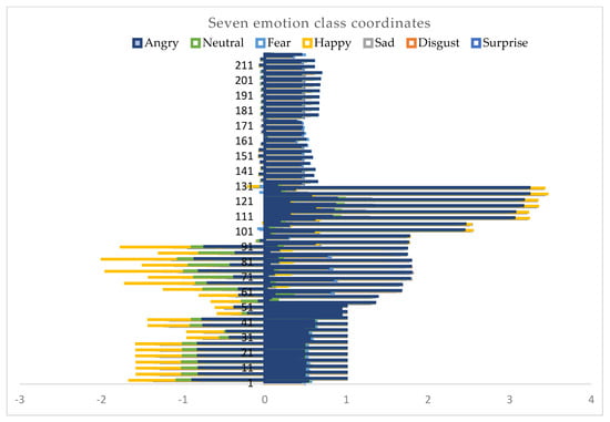 Figure 6 depicts more than two hundred facial landmark coordination of facial key-points on seven emotional classes. Figure 6 presents a small set of examples to show how emotional class coordinates represent in between minus three (−3) and four (4) in x axes. In real testing, the case model will make a prediction based on thousands of emotion class coordinates, as shown in Figure 7.
