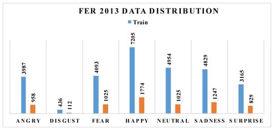 Based on the purpose of this study, the first step was collecting the dataset. We applied the 2013 Facial Expression Recognition dataset (FER-2013), which is available on Kaggle.com. The FER-2013 dataset was introduced at the International Conference on Machine Learning (ICML) in 2013 [43] by Pierrol and Aaron. The dataset consists of 35,887 images, with seven different types of facial expressions, as shown in Figure 5.